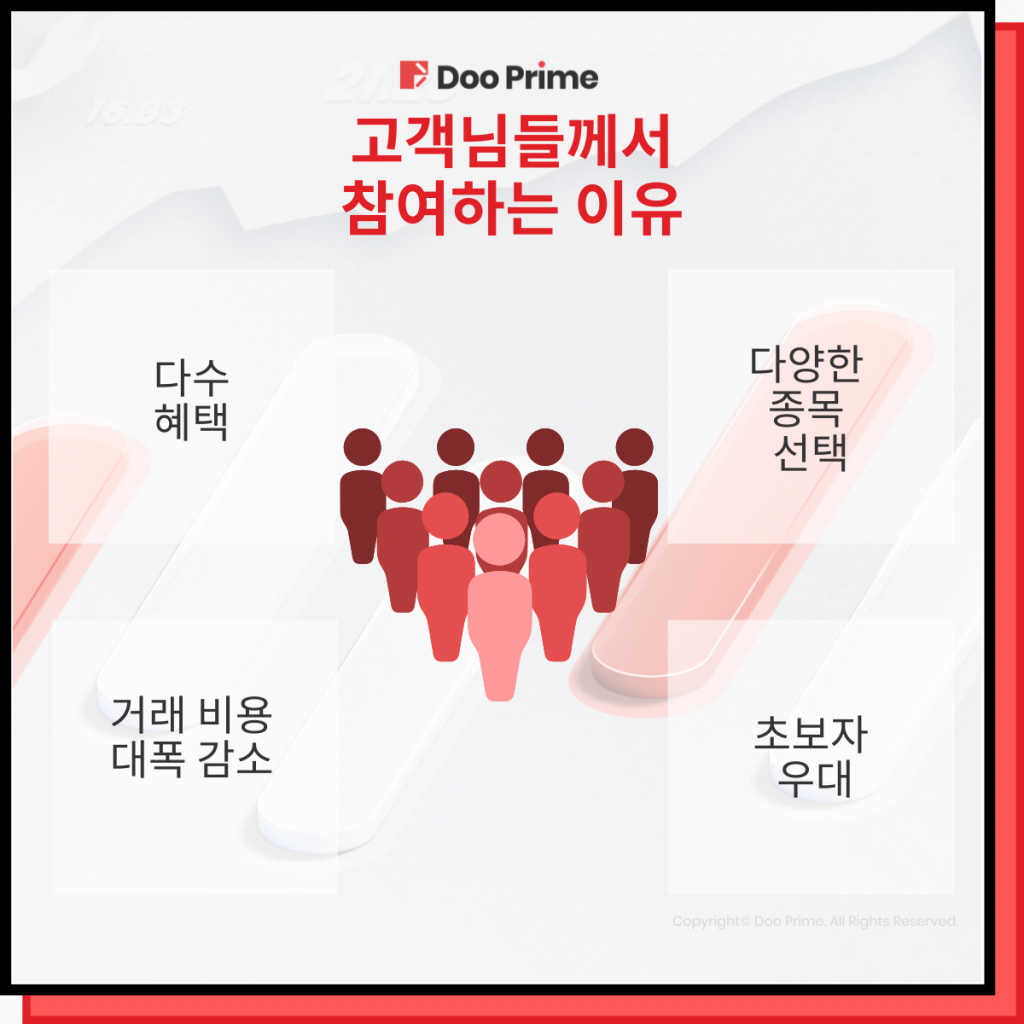 본 정보는 일반 참고용으로만 제공되며 어떠한 금융도구를 사고 파는  투자 건의, 추천, 청약 또는 초청으로 볼 수 없습니다.본문에 나타난 정보는 어떠한 특정 접수자의 투자 목표나 재무상태를 참고하거나 고려하지 않은 상황에서 준비되었습니다.금융기구, 지수, 혹은 패키지 투자상품의 과거 표현을 언급하는것은 모두 그 미래실적의 믿을만한 지표로 볼 수 없습니다. Doo Prime은 표시된 정보에 대해 어떠한 진술이나 보증도 하지 않으며, 제공된 정보의 부정확함과 불완전으로 인한 어떠한 직간접적인 손실이나 손해에 대해서 아무런 책임을 지지 않습니다.Doo Prime은 개인투자와 관련된 어떠한 직간접적 거래 위험, 손익에 대해서도 책임을 지지 않습니다.