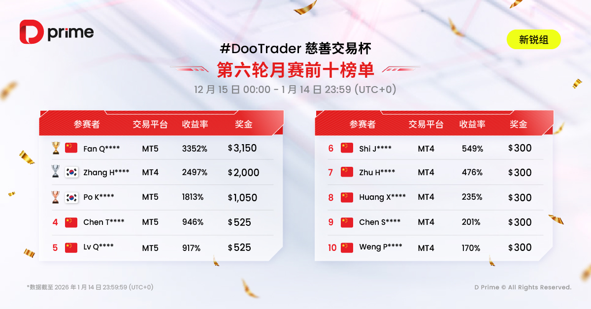 D Prime #DooTrader 자선 트레이딩 제6라운드 월간 대회가 1월 14일 23:59(UTC+0) 기준으로 성황리에 막을 내리며 치열했던 결과 랭킹이 공개되었습니다! 반년에 걸친 치열한 경쟁 끝에 6차례의 월간 대회가 모두 마무리되었으며 대회는 이제 서바이벌 아일랜드 최종 결전 단계로 공식 진입했습니다!
