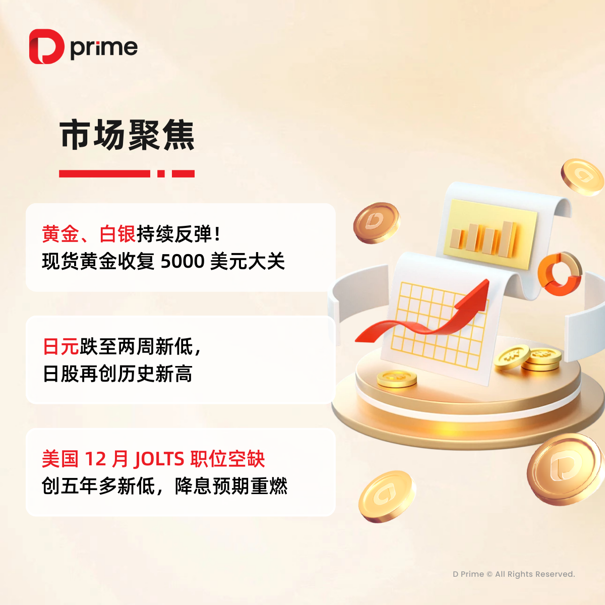 D Prime 精选研报 | 黃金、白银持续反弹! 现货黄金收复 5000 美元大关