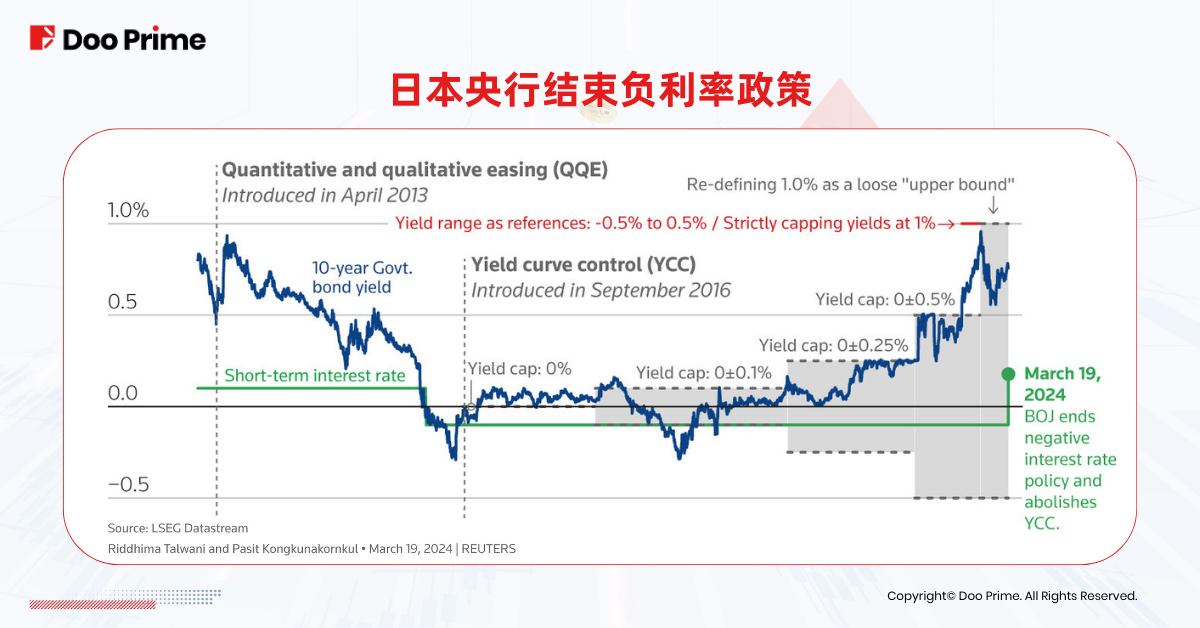 日本央行行长植田和男表示,“确认了薪资和物价上涨之间已出现良性循环,稳定实现 2% 的物价上涨目标已指日可待。”因此,日本央行如期收紧货币政策,不仅自 2007 年以来首次加息,也结束了长达 8 年的负利率与收益率曲线控制政策,引发全球金融市场热烈关注。