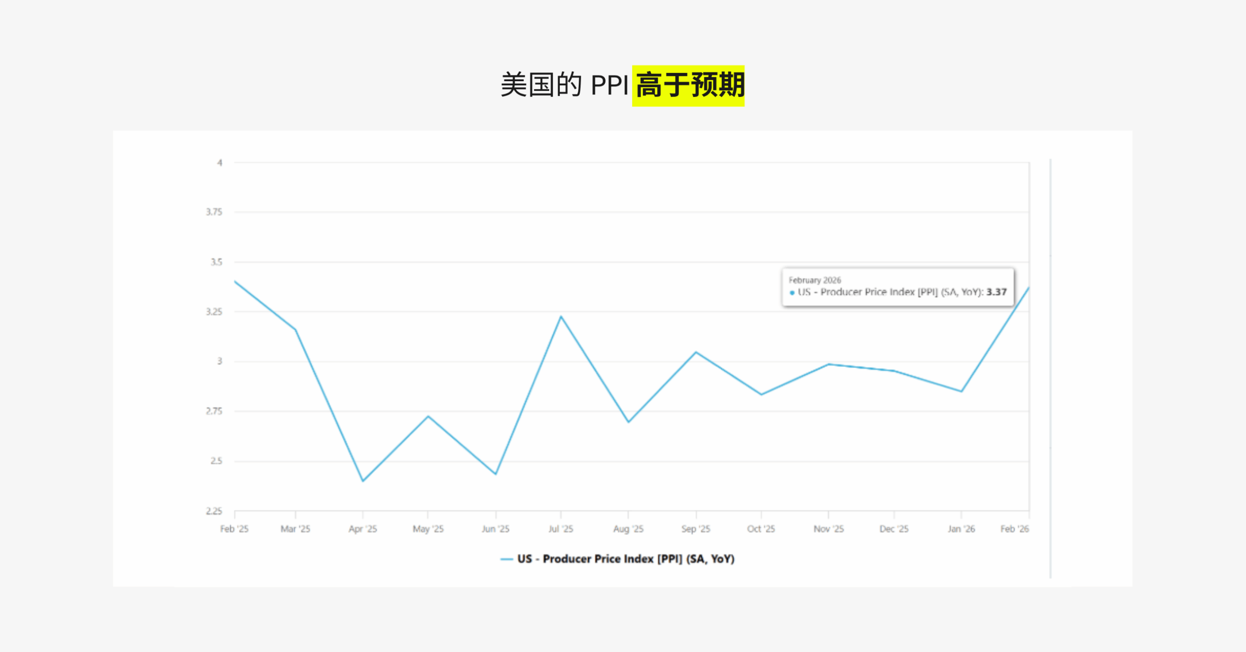 美国 2 月 PPI 环比上升 0.7%,高于前值 0.5% 和预期 0.3%;PPI 同比高达 3.37%,远超预期值 2.9%。值得注意的是,该数据发布时冲突尚未发生!这表明在战前,美国通胀已有回升迹象。