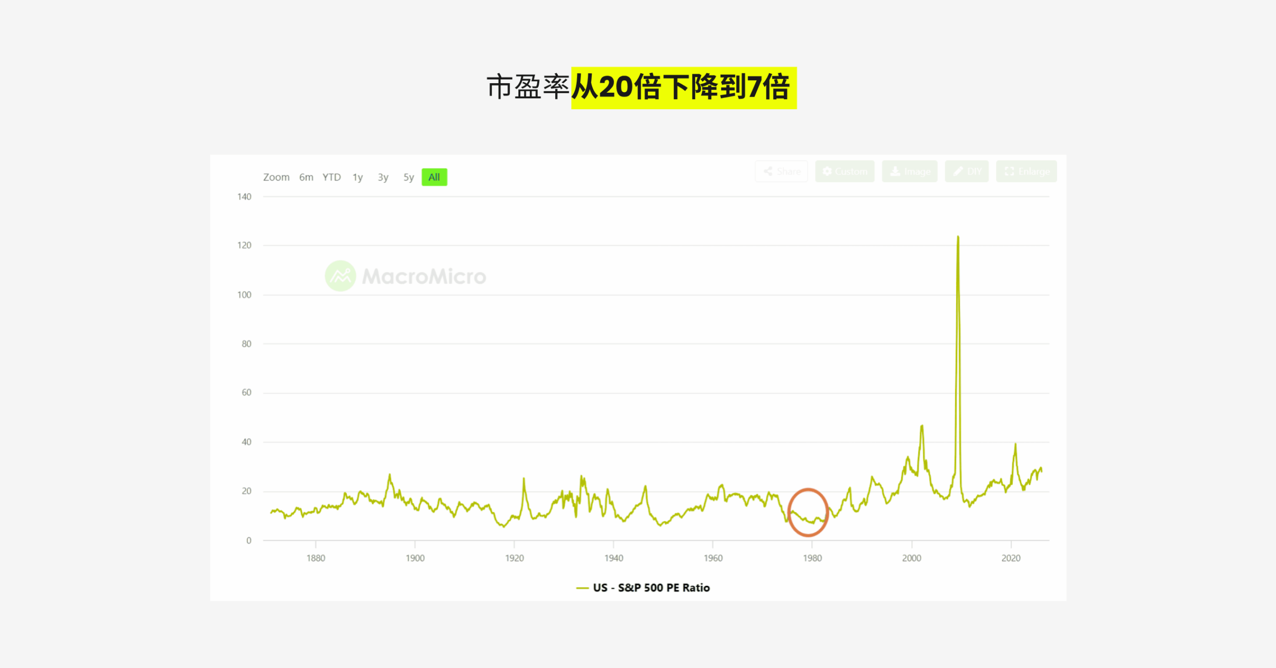 但是,随着市场悲观情绪被消化,股市也跌无可跌,随着盈利慢慢改善,股市开启了长牛行情。在第二轮滞胀中,也就是 1976 ~ 1980 年间,股市表现不俗,这一阶段股市盈利上涨全凭业绩驱动,加上信心恢复,估值也逐渐修复。