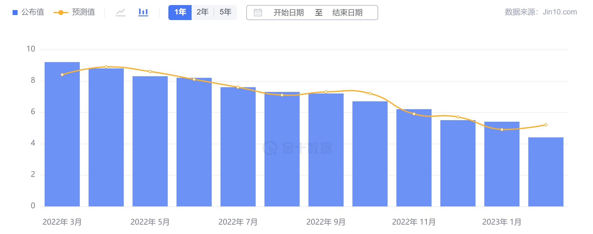 3 月 15 日,美国劳工部发布的数据显示,2 月生产者价格指数( PPI )环比下降 0.1%,低于预期的 0.3%,前值为 0.7%;同比增长 4.6%,也较上月的 6% 有所放缓,是 2021 年 3 月以来的最低增速。剔除食品、能源和贸易的核心 PPI 在 2 月环比增长 0.2%,低于预期的 0.4%,前值为 0.5%;核心 PPI 同比增长由 1 月份的 5% 放缓至 4.4%,同时也低过预期的 5.2% 升幅。