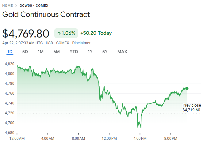 截至纽约时间下午 4:33,现货黄金下跌 2.3 %,报每盎司 4707.52 美元;白银价格下跌 4 %,现报 76.559 美元/盎司。