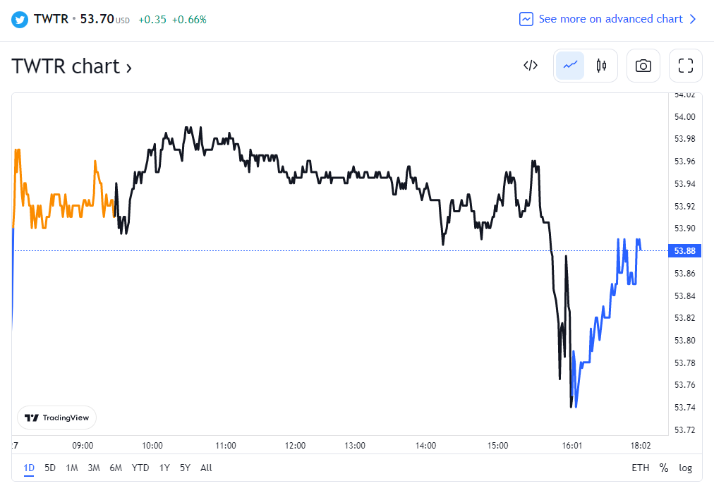 截止目前,推特股价上涨 0.66% 至 53.70 美元,越来越接近马斯克每股 54.20 美元的收购价。