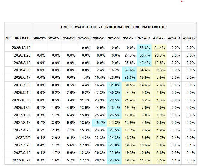 联邦公开市场委员会(FOMC)此次将基准利率下调至 3.75% 至 4% 区间。根据 FOMC 在 9 月会议公布的经济预测摘要,投票成员预计利率将在 2026 年降至 3.4%,暗示年内或仅剩一次降息空间。