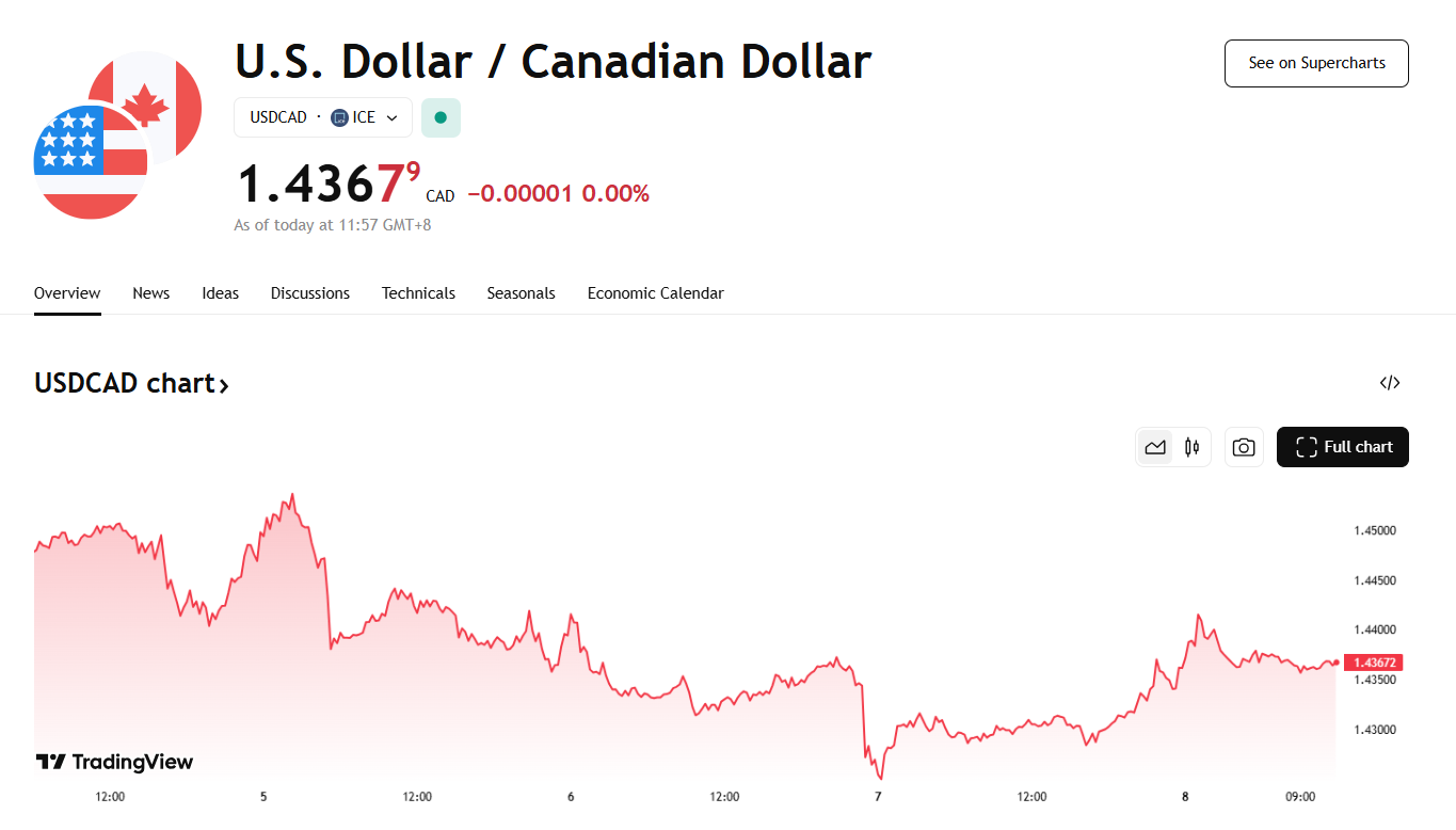 截至发稿,美元兑加元交投于 1.4367。上一交易日纽约汇市尾市,美元兑加元汇率收盘价为 1.4363。