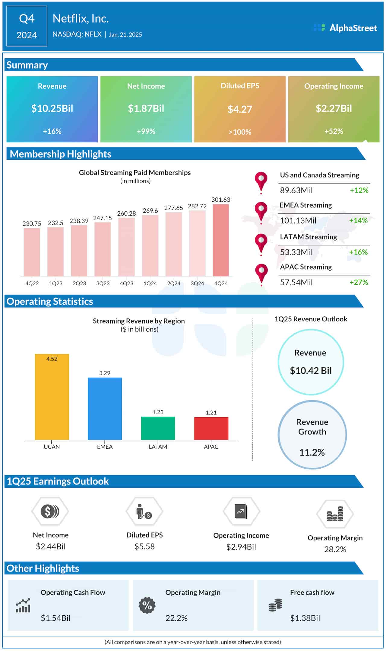 美股盘后,流媒体巨头奈飞(Netflix)发布了 2024 财年第四季度业绩,不仅营收、盈利双双超出预期,而且付费会员数量突破 3 亿大关,新增付费会员数量超过 1900 万,创历史新高,并同时上调 2025 年业绩展望。