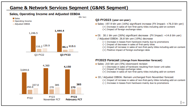 索尼上周公布的财报数据显示,在截至 2023 年 12 月的 2023 财年第三季度,旗舰产品 PlayStation 5 第三季度销量为 820 万台,比市场预期低了约 100 万台。索尼预计,在截至明年 3 月的财年中,PS5 的销量将达到约 2100 万台,而此前的预测则为 2500 万台。索尼还预计本财年销售额为 12.3 万亿日元,低于此前预期的 12.4 万亿日元。
