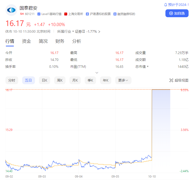 10 月 10 日开盘,A股三大指数集体高开,沪指高开 0.58%,深成指高开 0.49%,创业板指高开 0.49%;港股大幅高开,恒生指数涨 1.98%、恒生科技指数涨 2.85%。国泰君安、海通证券港股复牌,分别大涨 106%、134%,双双涨停。