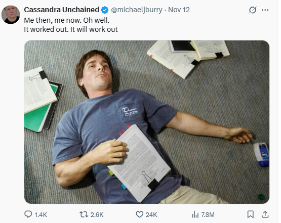 11 月 13 日至 14 日,因在 2008 年金融危机前精准押注次贷崩盘而闻名、并成为电影《大空头》(The Big Short)原型的美国对冲基金经理迈克尔·伯瑞(Michael Burry),在多次警告 AI 泡沫后,其旗下基金已正式终止向美国证券交易委员会(SEC)注册。