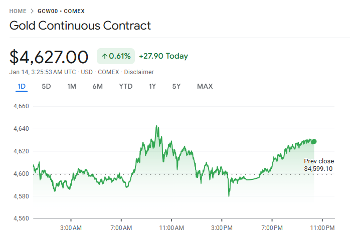 同期,COMEX 2 月交割黄金期货收跌 0.43%,报每盎司 4,595 美元,盘中最高触及 4,644 美元,同样再创纪录新高,但临近美股收盘时跌破 4,577 美元。