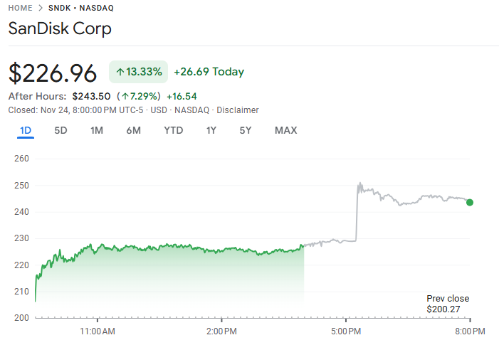SanDisk 自 2025 年 2 月自 Western Digital 分拆独立上市以来,仅用 9 个月便从 SmallCap 600 跃升至  S&P 500,股价从 36 美元暴涨至 226.96 美元,累计上涨 5.3 倍,突显市场对其 AI 数据中心存储业务爆发式成长的高度认可。
