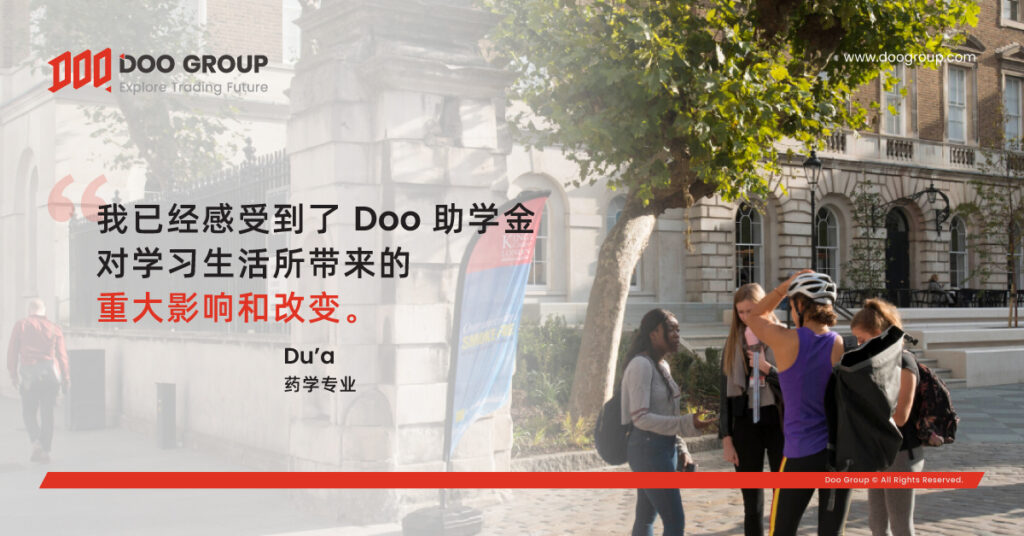 Doo Group 在 2021 年与英国伦敦国王学院合作设立了“ Doo ” 助学金,旨在为经济困难的学生提供资助,让他们更加从容地踏上大学的求知旅程,圆梦高等教育。成功申请 Doo 助学金的学生将在 3 年内每年获得总额 10,000 英镑的助学金,用于支付大学期间的学习生活费用。目前,已有数十名学生获得了 Doo 助学金的资助,并给予了积极的反馈。