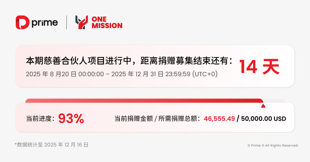 目前,距离 2025 D Prime 慈善合伙人计划募集期结束仅剩两周时间!云县特教学校运动场建设项目的善款捐赠金额已突破 90% 大关——这不仅仅是一个数字,更是无数温暖的汇聚。每一个特殊儿童的运动梦想,都因为您的参与而离现实更近一步。现在,让我们共同完成这最后的冲刺,用交易的温度注满最后一段爱心进度条。