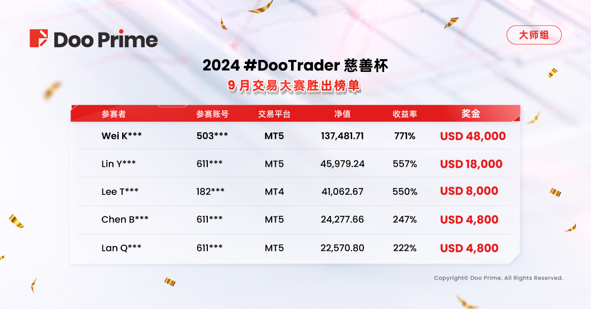 现在让我们一起回顾 9 月赛程的精彩瞬间,学习顶尖选手们脱颖而出的成功之道,向 #DooTrader 至尊杯十周年交易大赛中的冠军宝座发起冲击,瓜分高达 180,000 美元的奖金池!