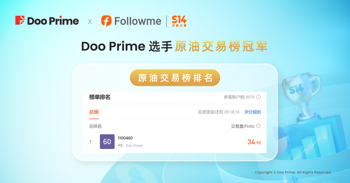 作为 FOLLOWME S14 交易大赛钻石赞助商,Doo Prime 选手可在大赛期间争夺 “月收益榜” 以及“月交易量榜” 2 个单项额外月榜冠军。所有报名参赛的 Doo Prime 新老账户均自动划分至 Doo Prime 月榜,角逐榜单冠军,共同瓜分 1,200 美元额外奖励。