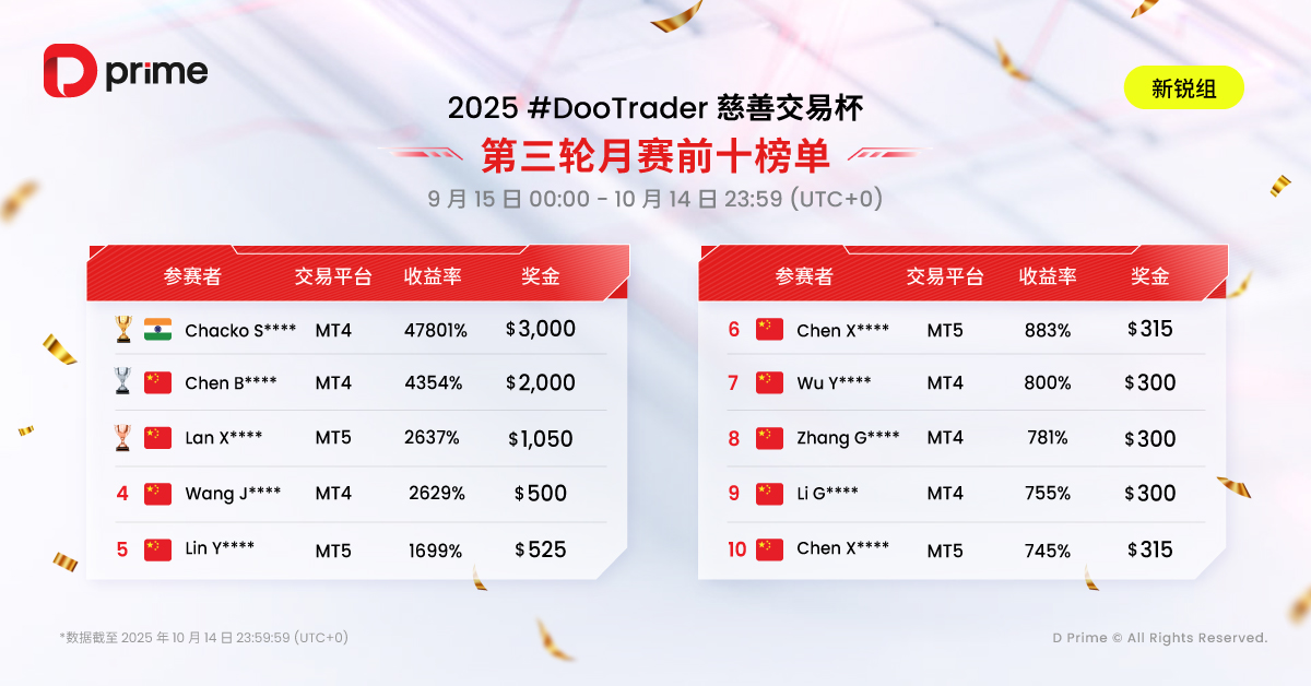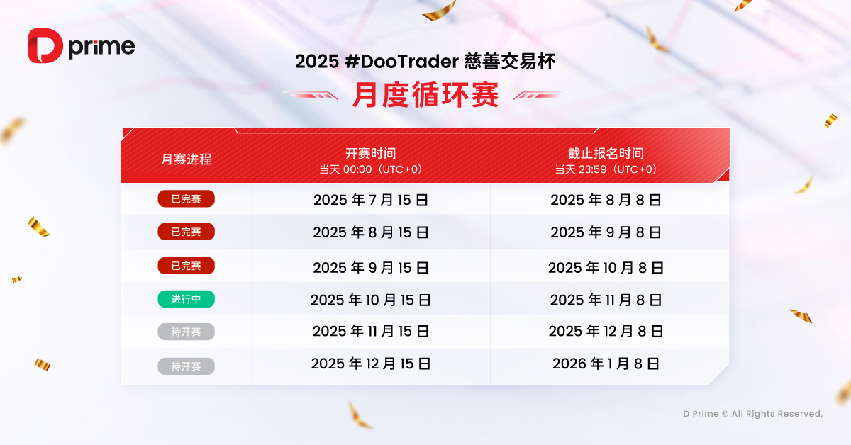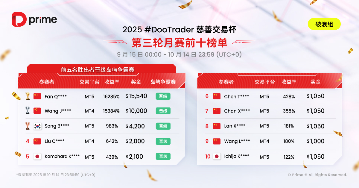 2025 年 D Prime #DooTrader 慈善交易杯第三轮月赛已于 10 月 14 日 23:59(UTC+0)顺利收官,最新榜单已火热出炉!第四轮月赛紧随于 2025 年 10 月 15 日 00:00(UTC+0)开赛 —— 欢迎各路交易高手立刻报名,争夺岛屿巅峰赛线下决赛名额!