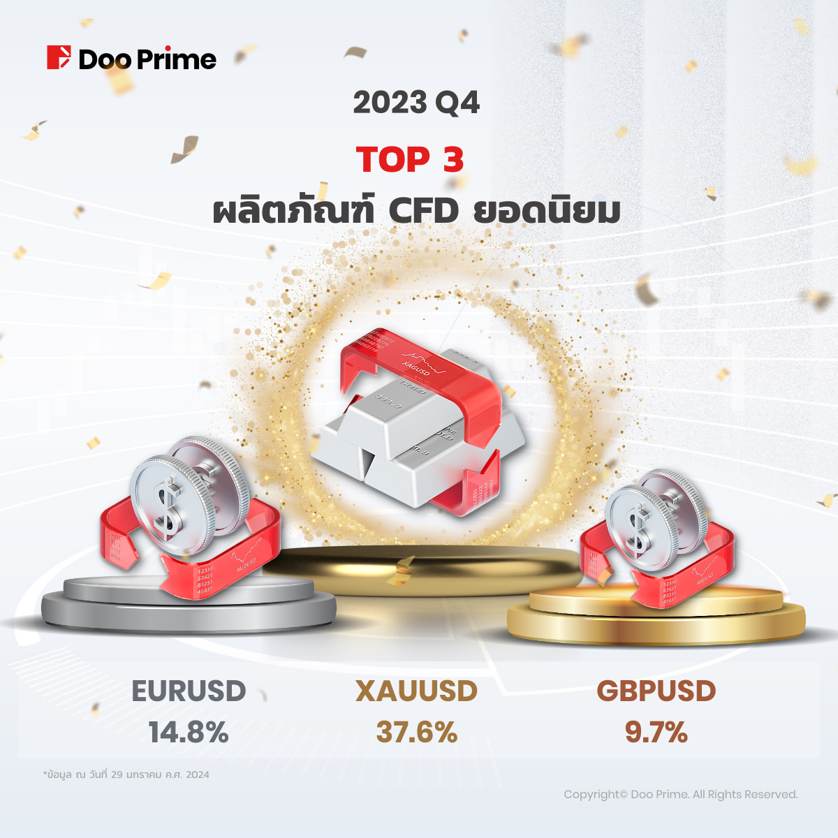 นอกเหนือจากผลลัพธ์ของปี 2022 และ 2023 ยังมีการกล่าวถึงผลิตภัณฑ์ที่มีประสิทธิภาพสูงสุดในไตรมาสที่ 4 ปี 2023 โดย XAUUSD อยู่ที่ 37.5%, EURUSD 14.8% และ GBPUSD ที่ 9.7%