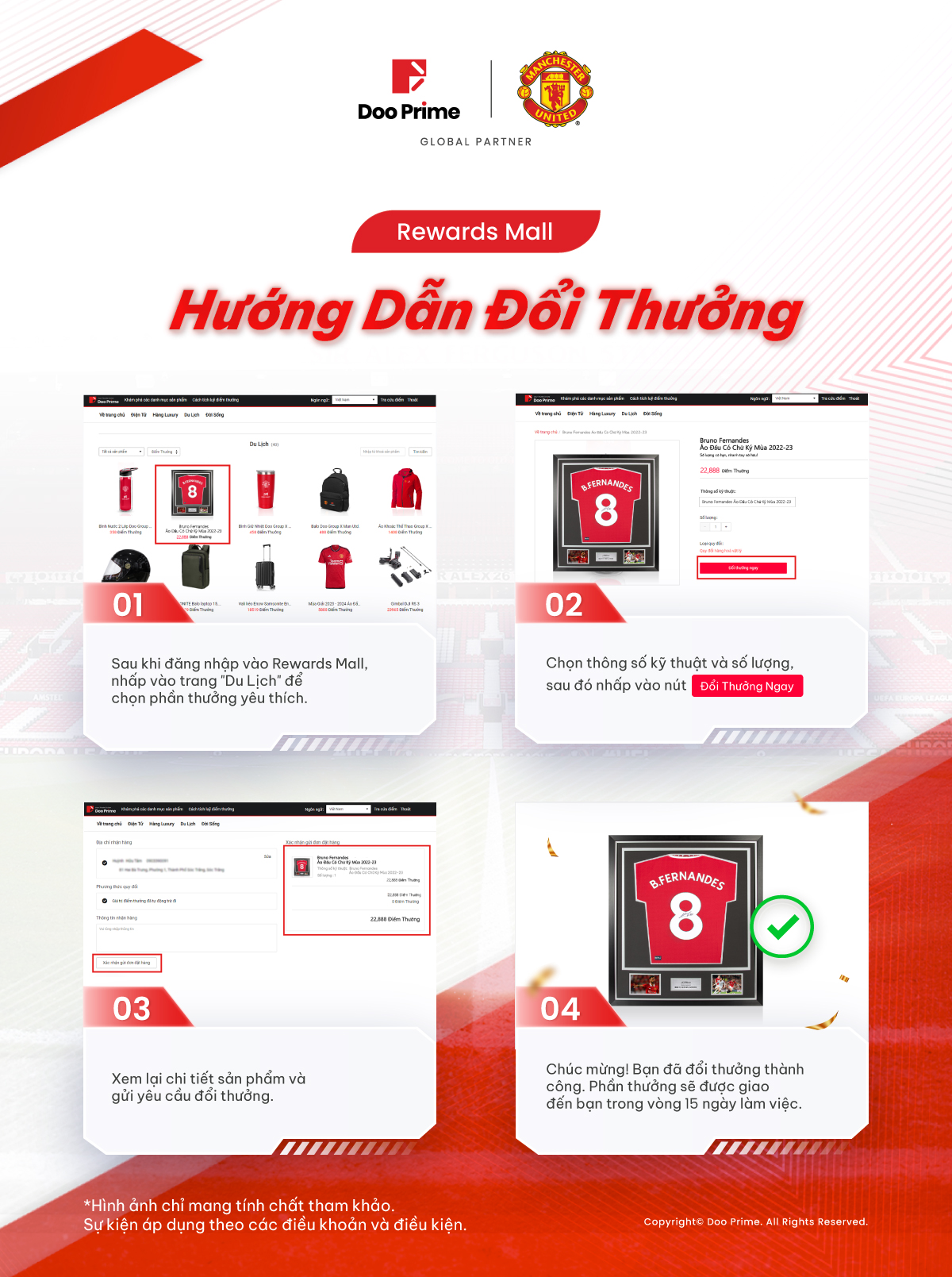 Ngoài áo thi đấu có chữ ký của Manchester United, bạn cũng có thể đổi nhiều phần thưởng độc quyền của Doo Group X Manchester United trên Rewards Mall. Với các phần thưởng hấp dẫn như như ba lô, áo khoác, cốc thể thao, v.v. Nhấp vào liên kết để đổi thưởng ngay. Doo Prime sẽ tiếp tục mang đến cho bạn nhiều bất ngờ hơn nữa và cùng bạn chào đón mùa bóng đá mới, cùng nhau bắt đầu cuộc hành trình giao dịch tuyệt vời.