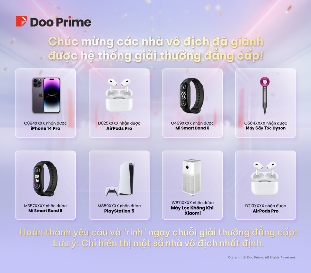 Tính đến thời điểm hiện tại, hơn 500 quà tặng và thưởng tiền mặt với tổng giá trị 100,000 đô la Mỹ đã được trao cho khách hàng cùng 5,000 người tham gia chỉ trong vòng hai tuần. Thông qua đó, chúng tôi mong muốn bày tỏ lòng biết ơn với quý khách hàng – những người đồng hành luôn ủng hộ và hỗ trợ cho Doo Prime trong suốt thời gian qua. Đợt quà đầu tiên đã chính thức được trao đến tận tay những người chiến thắng. Và đừng quên đón đợi những phần thưởng giá trị trong đợt ưu đãi tiếp theo nhé!