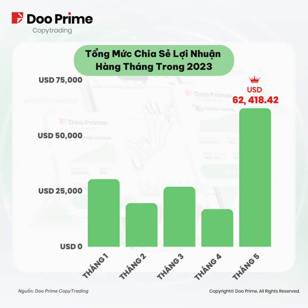 Đáng chú ý, Doo Prime CopyTrading đã ghi nhận một cột mốc chưa từng có trong tháng 5, với mức lợi nhuận trong tháng cán mốc 62,418.42 USD đối với tất cả các nguồn tín hiệu chất lượng cao. Con số trên đã “đạp đổ” những kỷ lục trước đó, đồng thời thiết lập một chuẩn mực mới hướng đến sự thành công kể từ khi Doo Prime CopyTrading chính thức ra mắt.