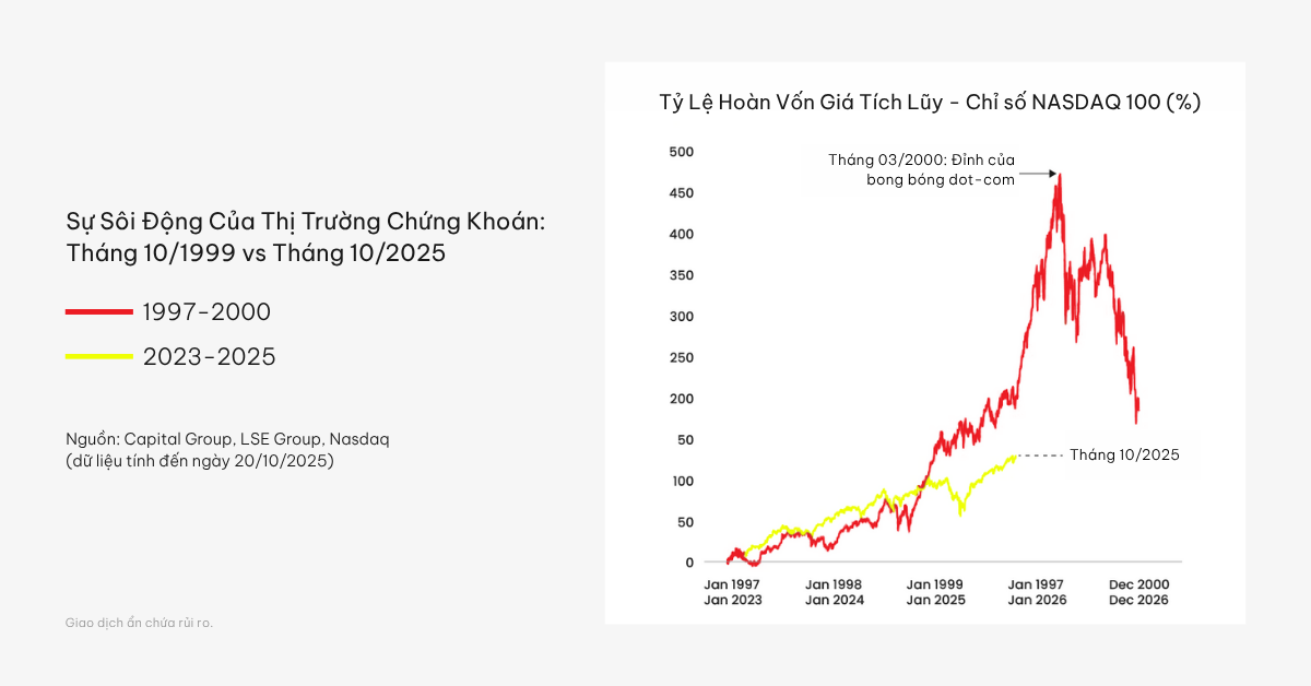 Tại sao lại nói vậy? Tính đến thời điểm hiện tại, chúng ta đã chứng kiến quá nhiều điểm tương đồng giữa hai cuộc bùng nổ mang tính thế kỷ này: từ sự tăng trưởng của các cổ phiếu AI, đến các biểu đồ hình parabol gợi nhớ đến đợt bong bóng dot com vào năm 1999.