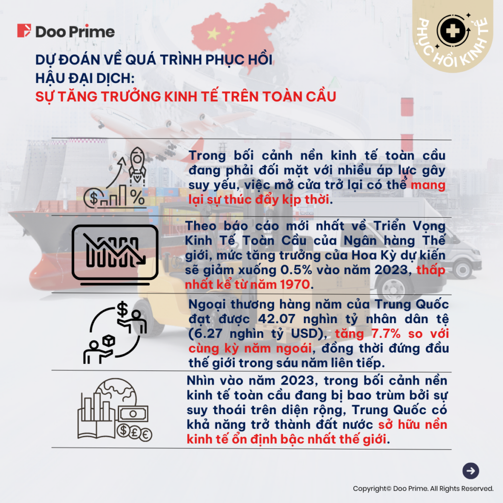 Vào ngày 7 tháng 12 năm 2022, Trung Quốc – nền kinh tế lớn thứ hai thế giới đã nới lỏng chiến lược Không Covid được thiết lập vào ba năm trước đó. Với sự áp dụng của chính sách trên, nền kinh tế Trung Quốc đã phải đối mặt với hàng loạt các thách thức khác nhau kể từ khi dịch bệnh chính thức bắt đầu. Tuy nhiên, với việc Trung Quốc tiến hành xoay trục khỏi chiến lược có phần hà khắc trên, nền kinh tế của nước này đã có dấu hiệu phục hồi kể từ cuối tháng 12 và dự kiến sẽ tiếp tục phục hồi mạnh mẽ hơn nữa trong thời gian sắp tới.